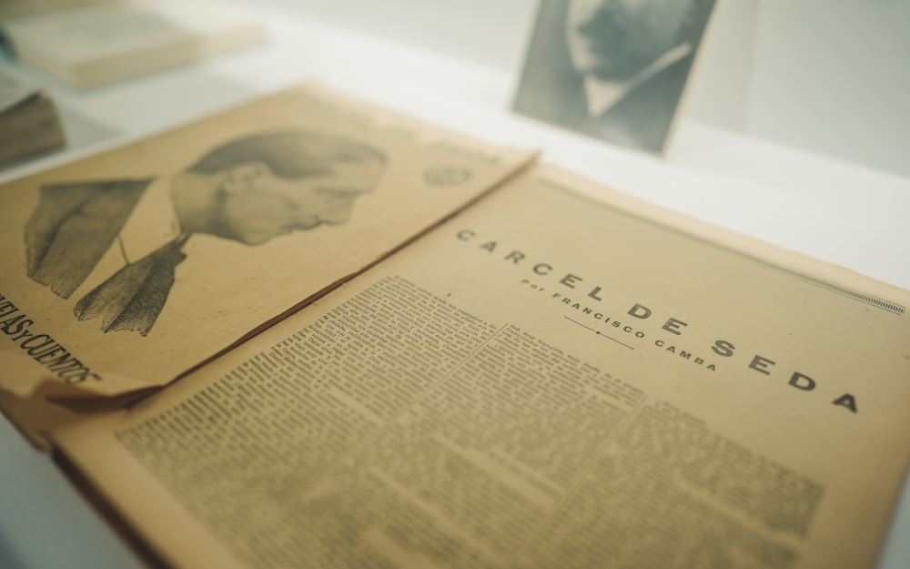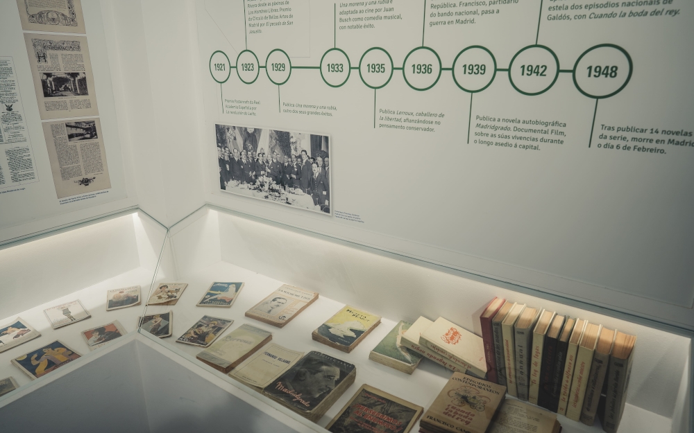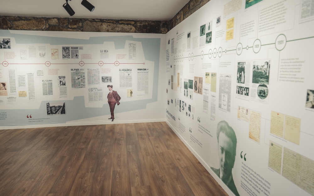 En la muestra encontrarás variados documentos que atestiguan su carrera como periodista y escritor. Verás extractos y páginas de distintos medios como La Idea Moderna (durante su época como maestro en Lugo); El Imparcial (en Madrid), así como portadas de varias de sus novelas.